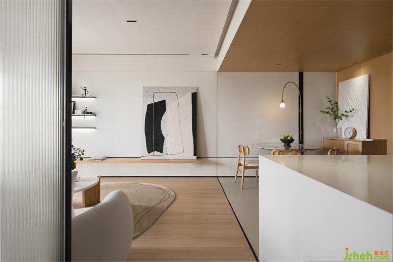 入戶餐廳的白色墻面延伸至客廳