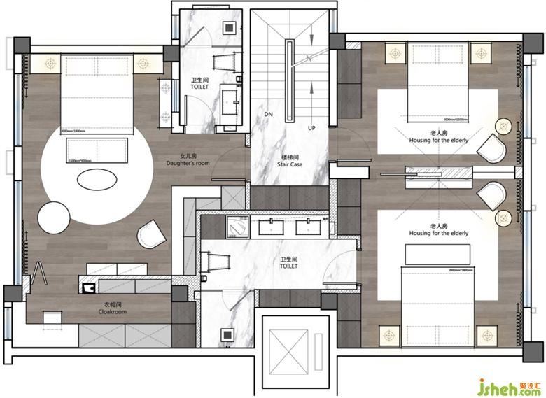 2、二樓布局老人套房與兒童房。兒童房把原本鏤空位置做現(xiàn)澆搭建,完善空間,增加使用面積;老人房做分離式套房,看似整體,卻相互獨(dú)立;