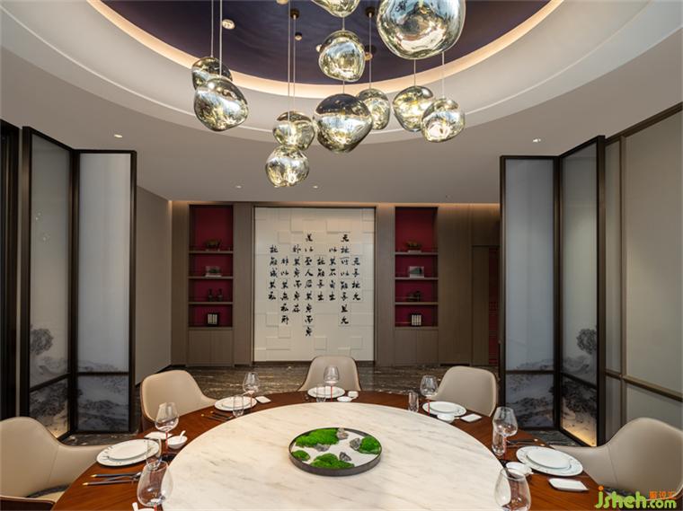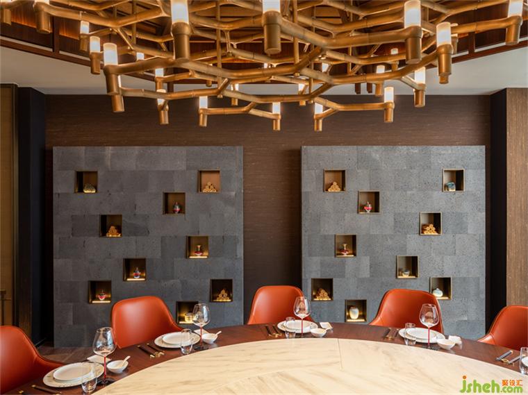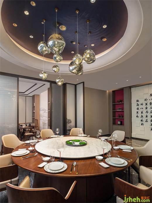 “兩岸潮涌,滄海一笑”,隱于紅塵之間,笑看人生百態(tài),這正是道家所倡導的入世姿態(tài)。深南道會所設計師正是抓住了這一理念,在空間設計上付諸巧思,將宴會區(qū)的燈飾設計為六角亭臺的造型,使客人感受到蘭亭集會的文人雅趣,暢享置酒會友、對飲和歌的快意豪情。