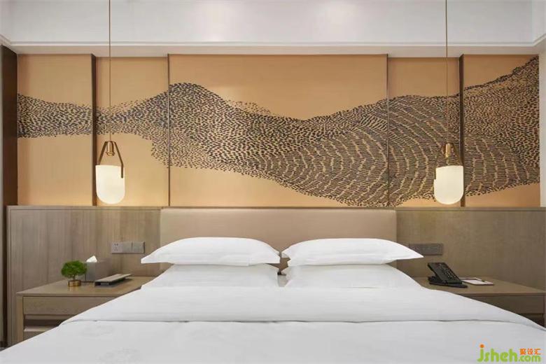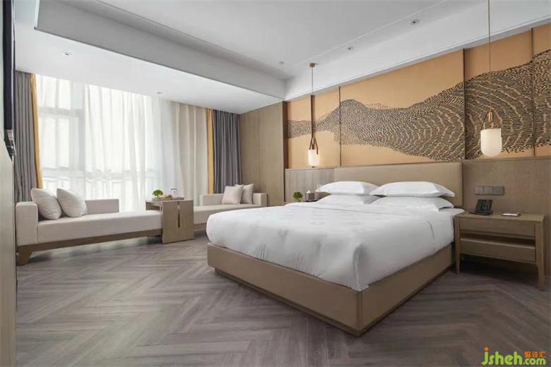 客房的硬裝設計延續(xù)了極簡與硬朗的風格,多以溫潤的原木材質鋪陳,在當代與傳統(tǒng)之間找到了靈感的最佳契合點。標準大床房取意于龍泉淺灘的流沙之景,貴州觀山湖酒店設計將沙礫翻涌的畫面具象為巨幅壁畫,滿鋪在房間的床頭背景,在霎那間給旅客帶來心靈震撼的同時,也將濃厚的貴州印象嵌入旅者的記憶,使自然意趣與人文精神實現(xiàn)貫通統(tǒng)一。