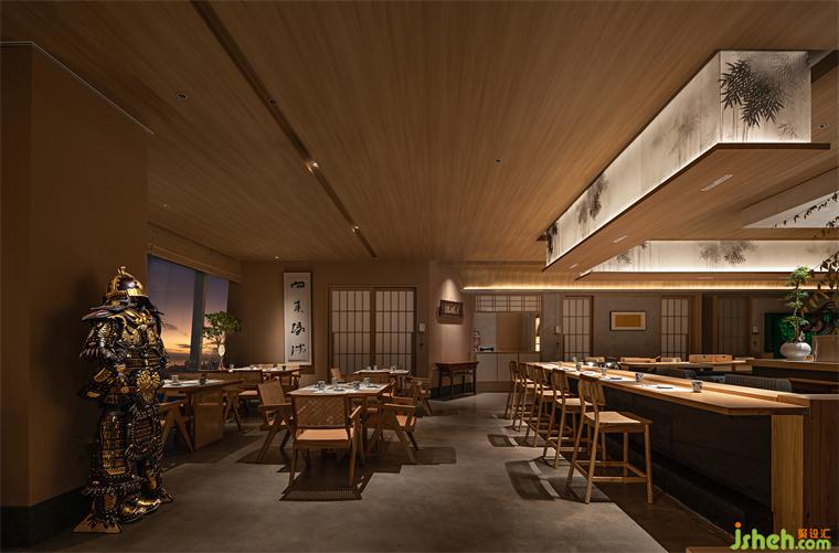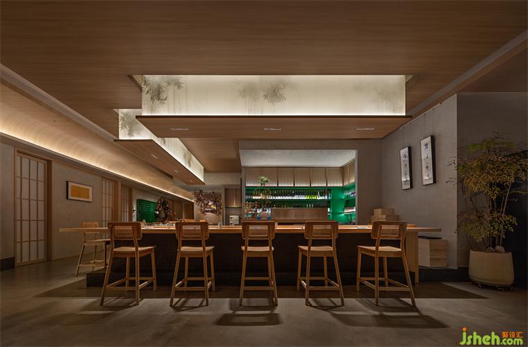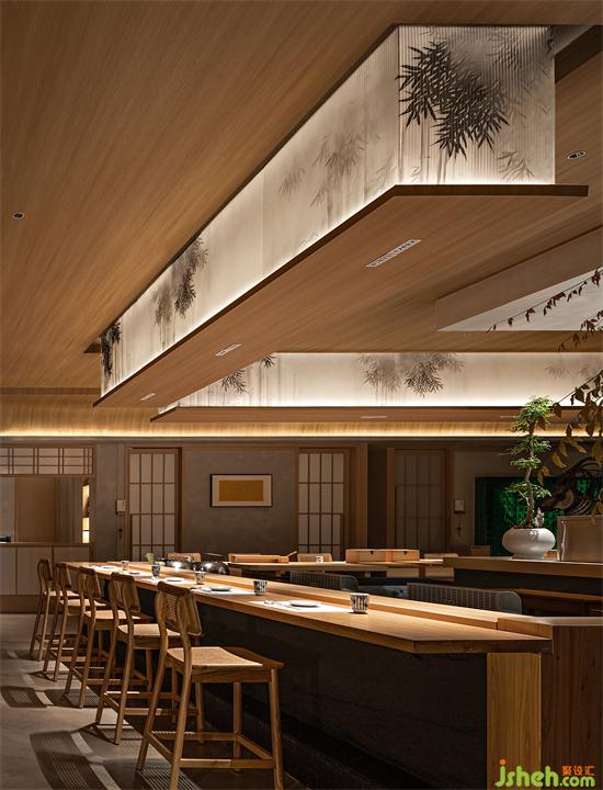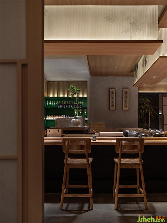 公共區(qū)域分為板前料理區(qū)與景觀卡位。料理區(qū)采用傳統(tǒng)半開放就餐形式,深圳晴舒料理設(shè)計師摒棄復(fù)雜繁飾,僅保留檜木、和紙及微水泥等自然材質(zhì)作洗練表達(dá)。單一簡潔的裝飾布局不僅體現(xiàn)了侘寂幽玄的至簡之美,更避免了空間裝飾喧賓奪主的可能,讓食客更能專注于食材品質(zhì)與用餐過程,品味料理本身的獨特魅力。