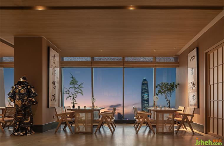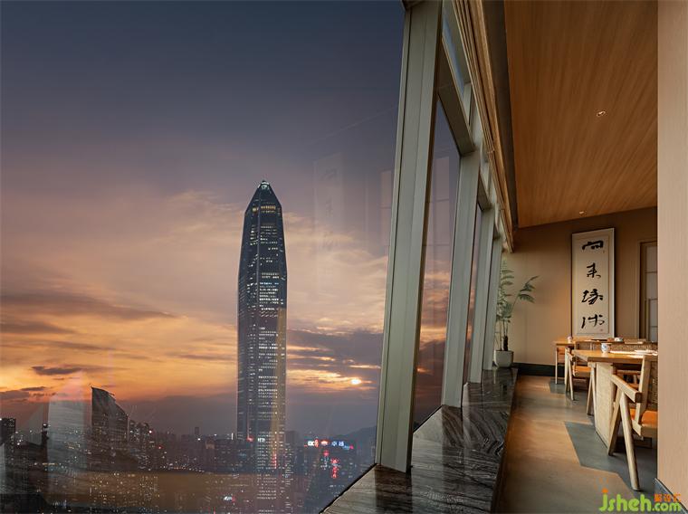 深入解讀晴舒,除感受美食匠心外,更須精神與文化的雙向奔赴。餐廳位于最繁華的皇崗商務(wù)中心皇庭V酒店53層,優(yōu)越的地理位置可將城市夜景一覽無余。深圳晴舒料理設(shè)計師借由巧妙分區(qū),最大限度地將外景納入室內(nèi),使食客或沉浸于板前燈火,或流連于窗外風(fēng)物,在自然景物的表達(dá)與追述之間感受空間情緒的微妙變化。