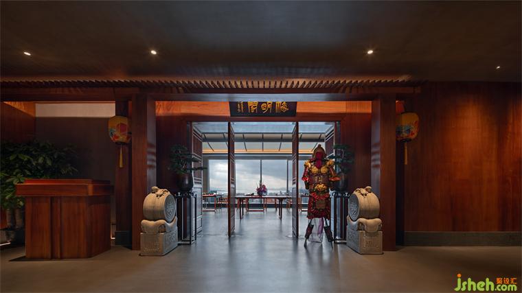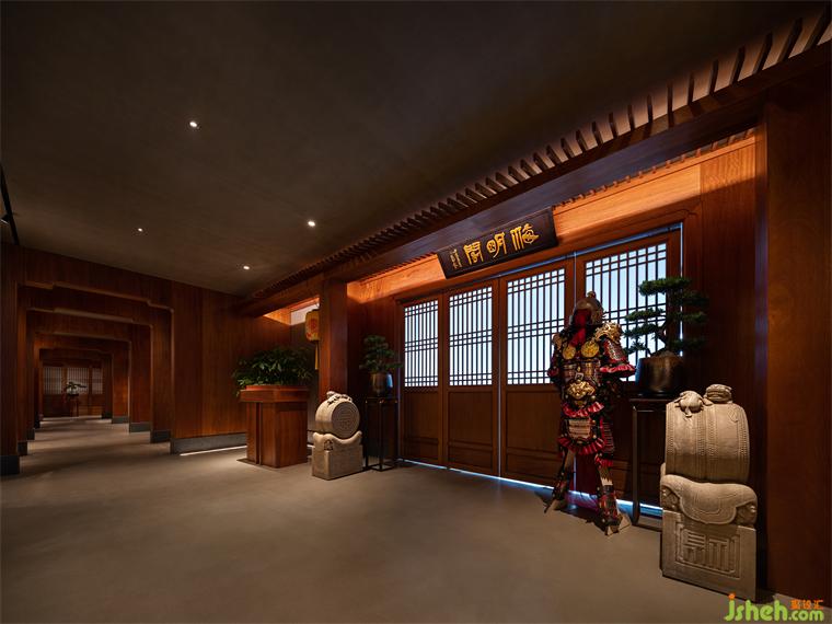 古人言“宅以門戶為冠帶”,入口延續(xù)了中式古典斜屋檐、榫卯結(jié)構(gòu)與典雅風(fēng)格,盡顯中國古代建筑文化之鴻圖華構(gòu)。兩尊抱石鼓立于左右,寓意福壽吉祥、花好富貴;深圳海明閣茶舍設(shè)計搭配英姿崢嶸的甲胄裝飾,領(lǐng)略古時金戈鐵馬氣吞山河的風(fēng)采,莊重威嚴(yán)之感撲面而來。木質(zhì)屏風(fēng)以障子紙覆之,通透輕薄,引入自然光線削弱了室內(nèi)空間的壓抑感。在光影的婆娑中,氤氳著風(fēng)雅的意境,素樸之美展露于方寸之間。