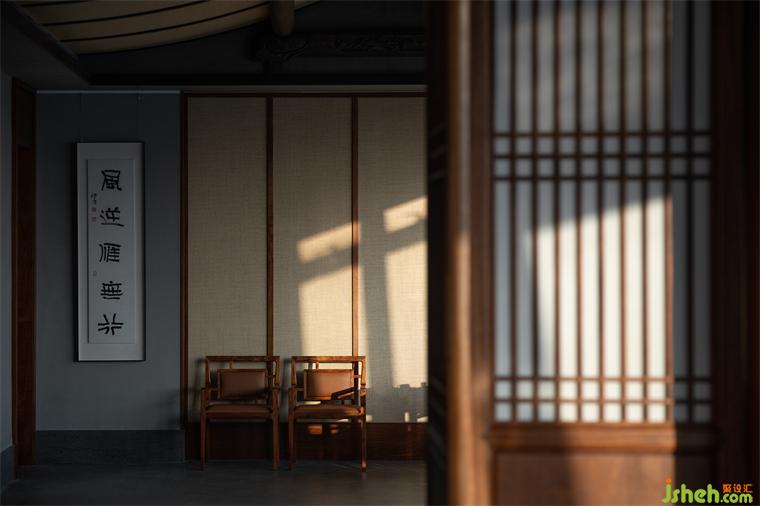 The house is capped with a portal. The entrance maintains the traditional Chinese style of slanted eaves, mortise and tenon construction, as well as graceful design, displaying the splendor of early Chinese architectural culture. With heroic armor decoration, we admire the ancient style of the emperor, and experience a sense of somber grandeur. Two stone drums are standing nearby, signifying happiness, longevity, and good fortune. Shoji paper, which is transparent and thin, covers the wooden screen, and the addition of natural light lessens the interior space’s feeling of oppression. Simple beauty is revealed in every square inch of the dense and graceful artistic vision of the dance of light and shadow.