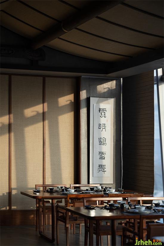 "Adjust to the surroundings remains the utmost." The sloping roof design heightens the multipurpose gathering space. The material is natural and the ecological wood ceiling is used to display the delicate and understated elegance. Low saturation color systems restore the natural authenticity while the texture of the woven wall fabric is evident. A strong Oriental aesthetic vision is produced by the inclusion of lighting and outdoor light, which warms and softens the overall environment.