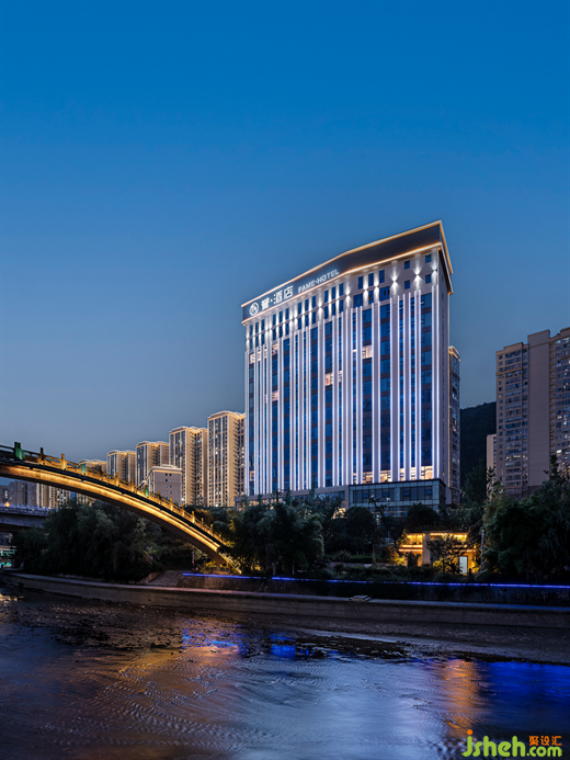 “山為魂魄,蔥翠崢嶸,水為脈象,湯湯靈性”。甕安縣地處貴州黔南地區(qū),烏江橫貫,森林蓊郁,實現(xiàn)城市與自然的無縫銜接。本案于都市和園林間落址,沐曉鳳暮靄,看林蔭夕照,觀風物長宜,酒店設計以生態(tài)與人文涵蘊一域藝術雅集。