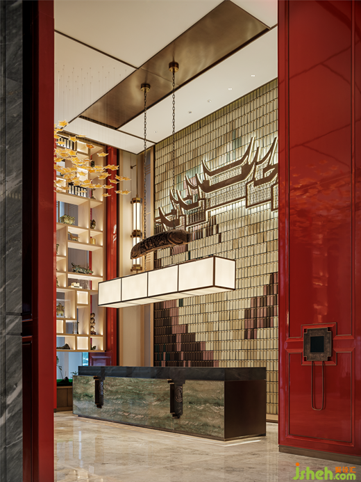 “東風夜放花千樹,更吹落,星如雨”,踏入大堂,即可自設計語言中感受“火樹銀花不夜天”的盛大場景,正紅立柱如朱門開敞,以古典禮儀展示迎賓納福之姿。空間中央以大理段式通用貝幣為景觀賦形,將段氏文化融鑄于空間的骨骼脈絡之中,于一物一景間氤氳氏族情懷,一磚一木中匯集文人雅韻。