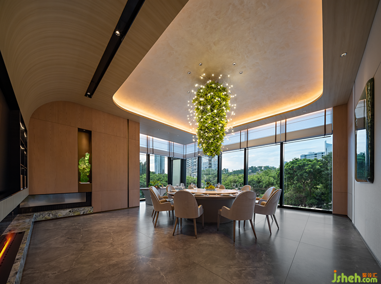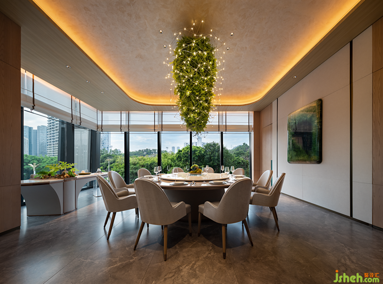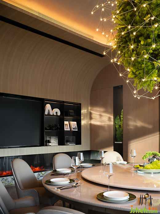 郁郁青春,草木輝發(fā),花下秉燭,春夜宴飲,故名“望春酌”。潮菜餐廳設(shè)計(jì)師將自然草木形態(tài)引入空間肌理之中,花木從石材和原木從抽枝延伸,蒙絡(luò)著瑩瑩燈火,將春夜詩(shī)景徐徐鋪展于眼前,盡顯自然野趣。Lush youth, grass and trees, flowers and candles, spring night banquet, so the name "looking at the spring drink". The designer introduces natural grass and trees into the texture of the space, flowers and trees from the stone and logs from the extension of the branches, covered with glittering lights, the spring night poetic scene slowly spread in front of us, showing the natural interest of the wild.