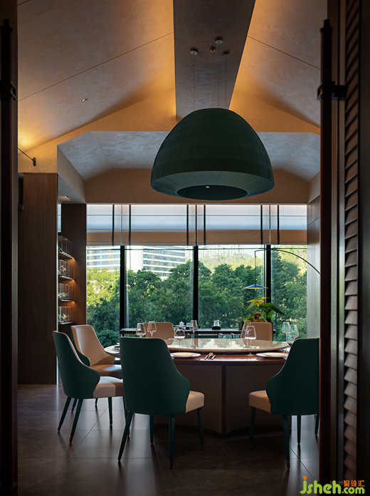 “玲瓏翠”以翡翠為主題,空間中大幅應(yīng)用青碧欲滴的翠色,奢華感足臻上乘。 宴客于此間,座中故雨新朋,飲敘開懷,四周碧色如翠,盡顯風(fēng)骨。