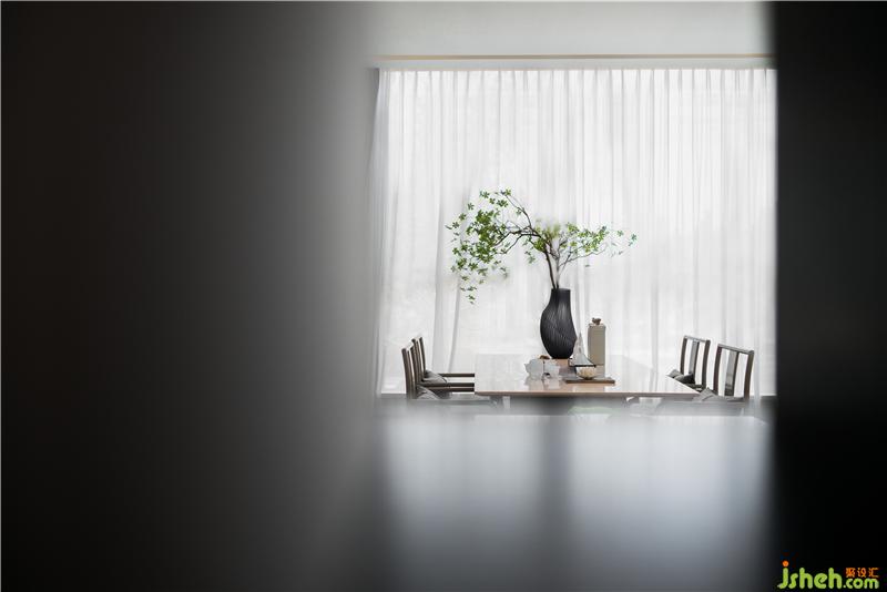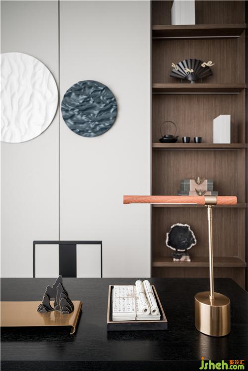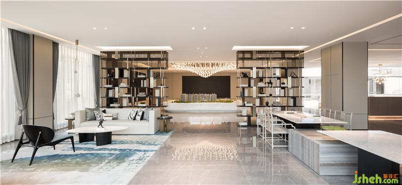 光線定義著空間的氛圍和感覺(jué)。沙盤(pán)燈取形于蕩漾流動(dòng)的漣漪,光影自然流動(dòng)間營(yíng)造出精致而輕盈的視覺(jué)體驗(yàn)。博物架錯(cuò)落隔開(kāi)不同的功能區(qū)間,東方意境在遮蔽與顯現(xiàn)的曖昧關(guān)系中含蓄流露。售樓處設(shè)計(jì)