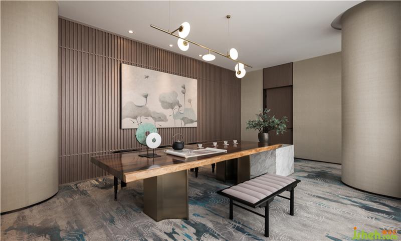 變幻的水波紋浸潤(rùn)出欲滴翠色,開(kāi)辟出品茗區(qū)的沉靜悠遠(yuǎn)。一幅荷塘寫(xiě)意畫(huà)風(fēng)致動(dòng)人,筆法疏淡,與深色的背景墻巧妙平衡。售樓處設(shè)計(jì)