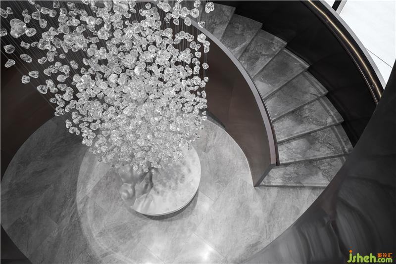 旋梯扶搖而上,軸心處水滴落石騰空而下,仿佛時光在流動之中倏忽停擺,將萬物于片刻中定格成了永恒光景。碎雨擊石,嘈嘈切切,落在水色氤氳的石材上四下漫淌,澄觀的詩意有如實質(zhì)。