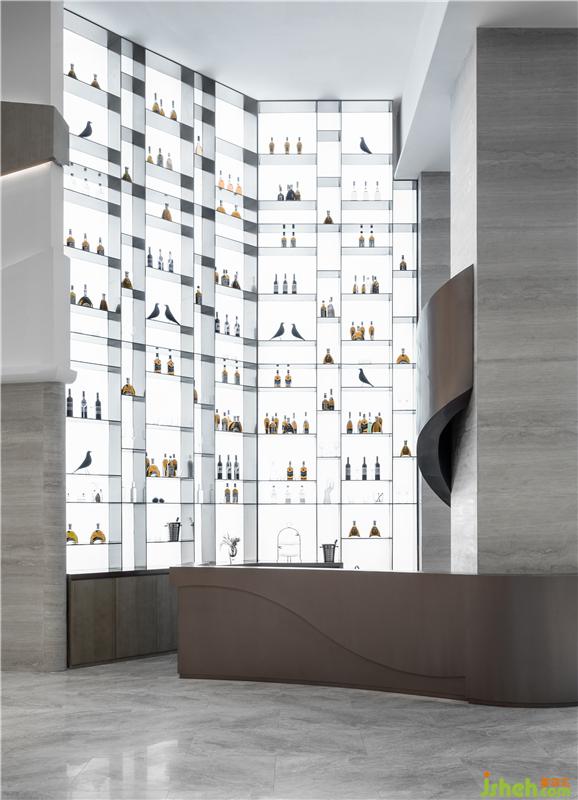 洽談區(qū)另外一側(cè)的水吧臺也形成了鮮明的視覺焦點——兩層高的玻璃酒架在內(nèi)置燈帶的烘托下顯得明亮通透,水吧臺面則延續(xù)旋梯造型,如飄帶漫卷而上。裝修設(shè)計