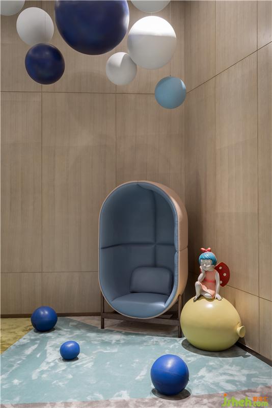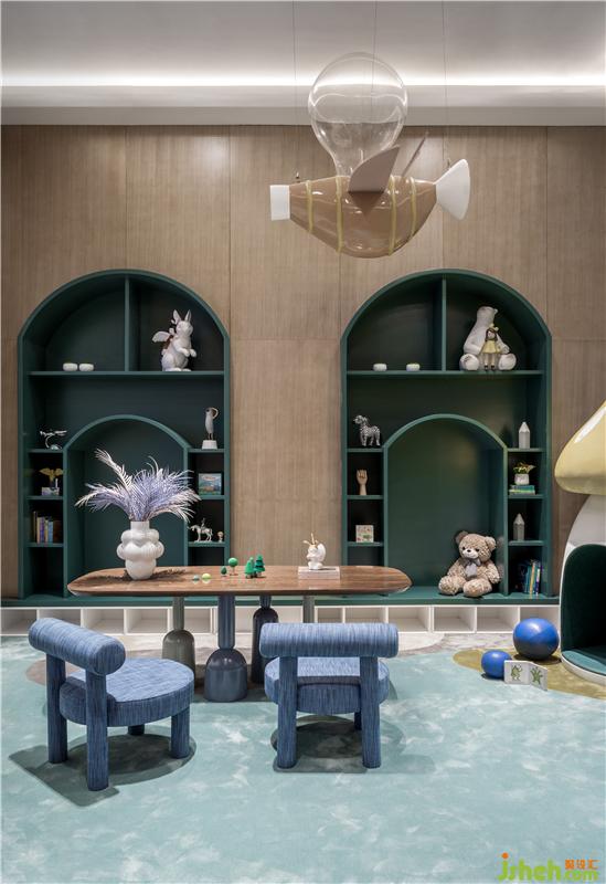 曲線亦是最合孩童天性的筆觸,圓角的桌椅、書柜擯棄了直白的棱角,賦予觀者柔軟的視覺體驗。同時,湖藍、淺碧、墨綠、暖木、深藍、明黃迭拼其中,在童眼里營造出夢幻的童話國度。裝修設(shè)計