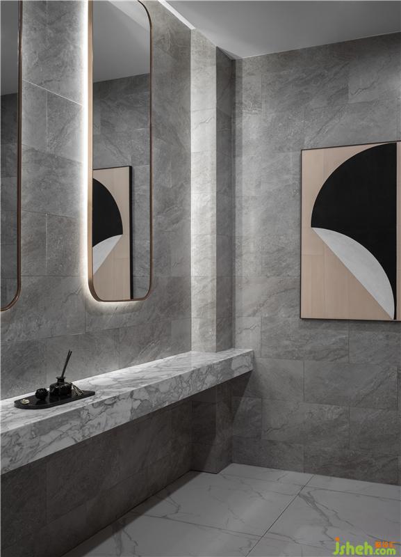 洗手間內(nèi),材質(zhì)的水波紋肌理在立面上得到了延續(xù),純粹的淺淡背景讓這一隅空間更為靜謐松弛。鏡面的圓角、現(xiàn)代掛畫裝置則以不同形式呼應(yīng)著曲線的主題。在設(shè)計師的敘述里,紫薇的纖巧、曲線的起伏成為了幻化萬千的原象,于古今之間構(gòu)筑起聯(lián)通的呼吸。由此發(fā)想,也只有將歷史推演至當下,讓文化扎根于生活,東方的情味似乎才能真正地融于我們的感官——清雅而自然,生生而不息。