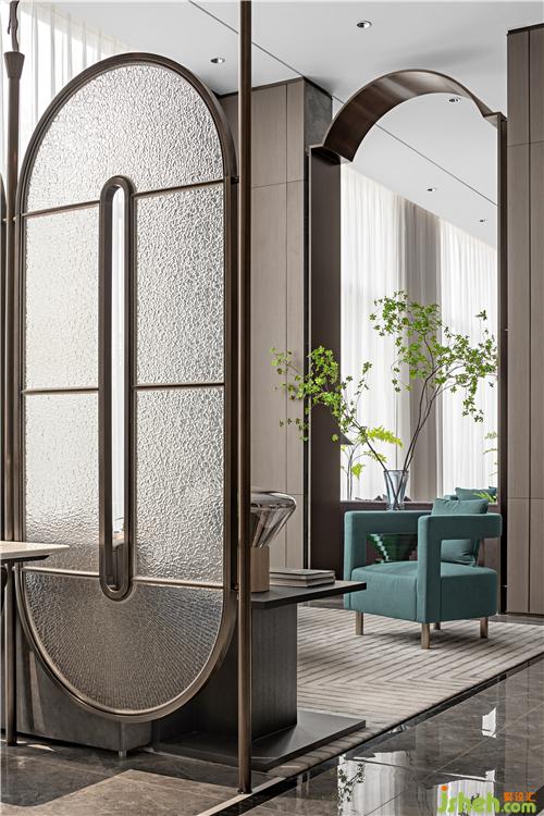 透過掩映的翠葉張望,洽談區(qū)里飛泉綠與高級灰錯落交織,愜意而不失高級感。磨砂玻璃的極簡屏風作為隔斷對稱陳列,通透之余也強化了簡潔的秩序力度。