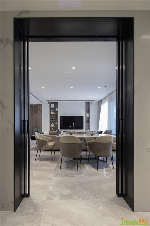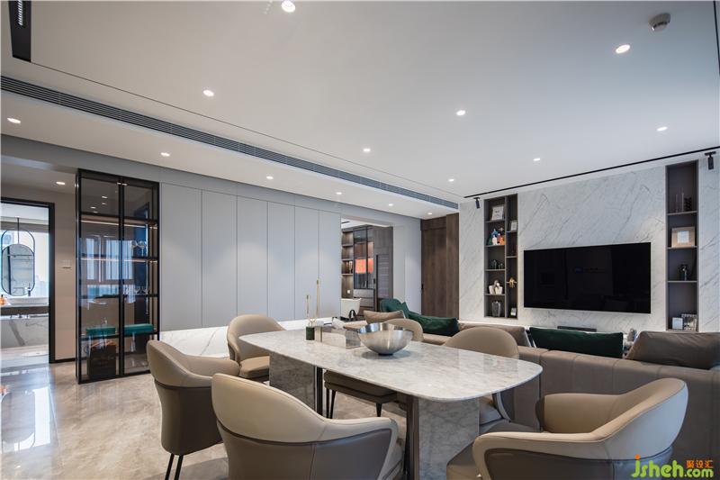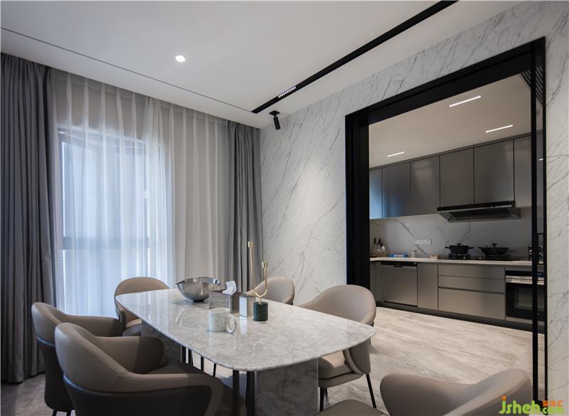 金屬拉絲高級灰與貫穿生活陽臺、包括廚房和餐廳。提供了和諧和無縫的體驗,合理的功能分布廚房的功能性是必不可少的??臻g非常細致,與人的尺度和觸感成比例,深圳裝修設計同時注重人體工程學。