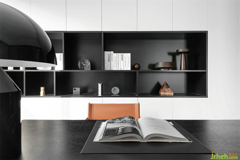 抽象幾何掛畫,點亮了整個書房;給人以無限遐想,思考的維度也無限延伸。玻璃移門圍合書房空間,實現(xiàn)了視覺最大化;采光極好讓人心境明朗。一整面的收納+局部展示柜,美化實用功能,保證了空間的整潔完整;半開放的層板設(shè)計更是增加了空間與空間的通透與藝術(shù)性。