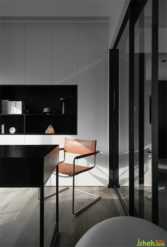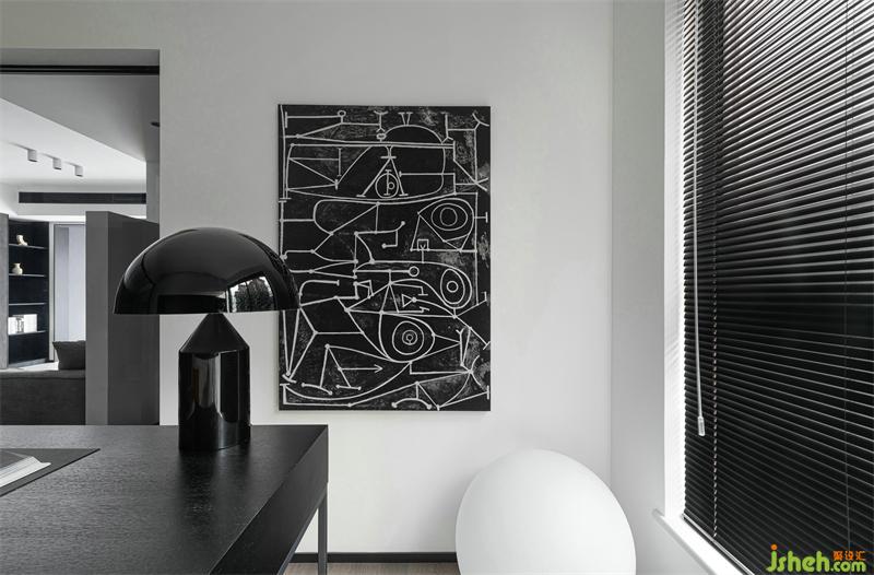 推開橙色的座椅,伸個(gè)懶腰來(lái)緩解疲乏;屋外的陽(yáng)光斜射在臉龐,溫暖又恬靜。百葉簾的隱約開合、抽象藝術(shù)掛畫的存在、圓形燈球的交匯相應(yīng),給書房空間注入別樣的氛圍。抬頭一看,客廳餐廳的家人們各自忙活,不亦樂乎,內(nèi)心充盈而滿足。幾何體充滿著整個(gè)書房,像極了我們每個(gè)不同的幾何人生。