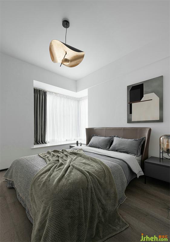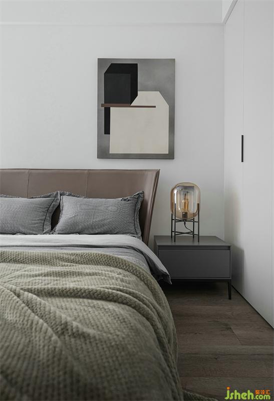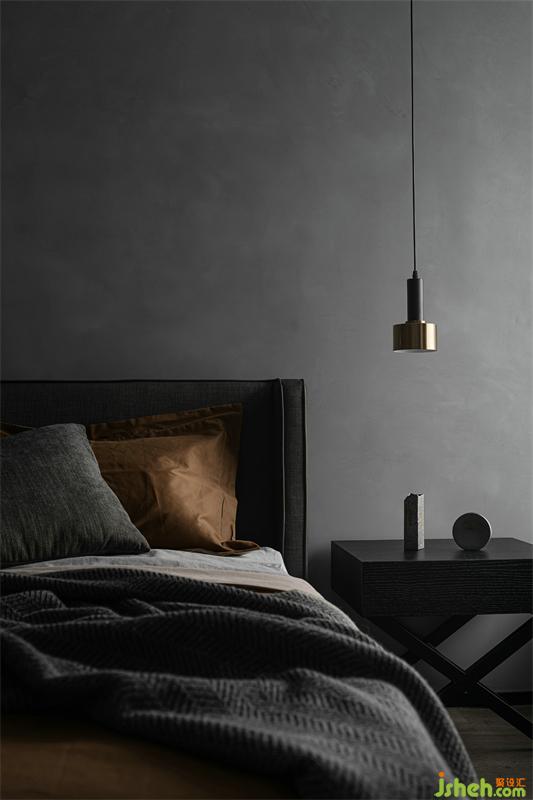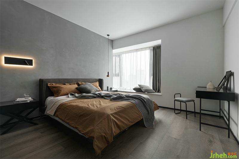 The dark fabric and the dark bedside table set off the cement paint wall background to give the bedroom a sense of tranquility. The combination of the small bronze chandelier and the mottled metal ornaments makes the bedside more fun and exquisite. feel. The moment I opened the door of the master bedroom, my whole heart was relieved; the simple and comfortable feeling hits, I can’t help but fall in love with this simple and warm and not messy nestCement paint, matte wardrobe, linen-like headboard, different levels of The presentation of gray-scale colors and its own texture, coupled with the richly colored bedding, continues the design framework of the living room, avoids the single color of the space, and also adds a touch of warmth to the master bedroom. The wall lamp and small chandeliers at the bedside make the space One more sentiment.