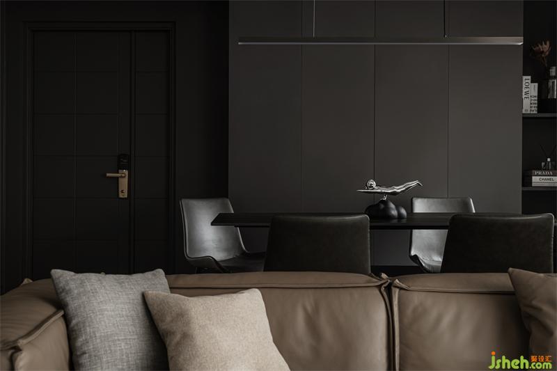 The entrance door (special paint) is changed to the same color as the background wall, which makes the originally discordant wall surface unified. The choice of slate dining table makes the texture more obvious and harmonious.
