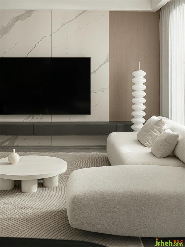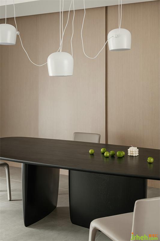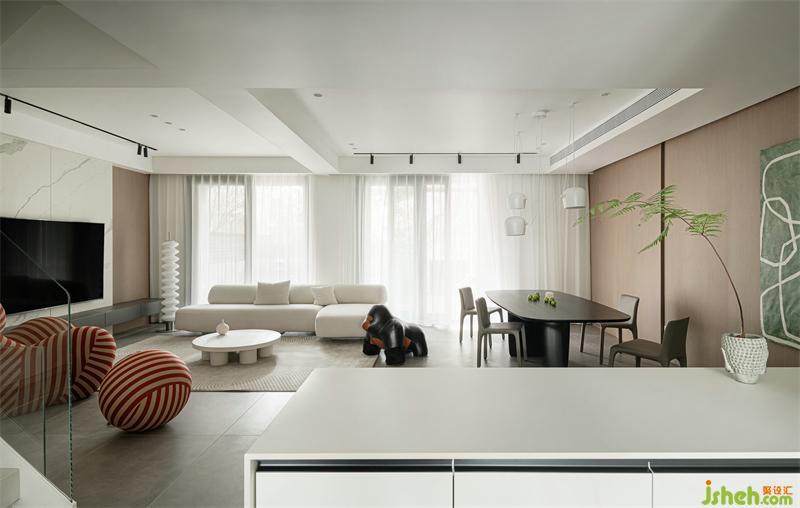 柔白、原木色為整個空間的主色調(diào),復(fù)式設(shè)計(jì)搭配有色彩的軟裝飾品,讓空間靜謐而不單調(diào)。沙發(fā)對坐設(shè)計(jì)營造家人交流分享的親近空間,同時讓餐廳區(qū)域動線更流暢。
