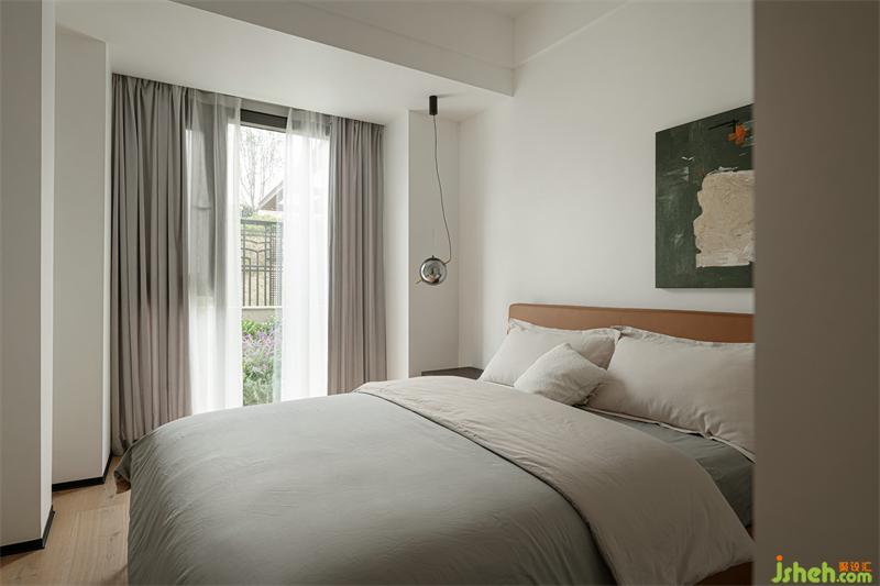 客臥窗外花園景色入室,復(fù)式設(shè)計(jì)室內(nèi)掛畫(huà)與窗外色調(diào)呼應(yīng)。