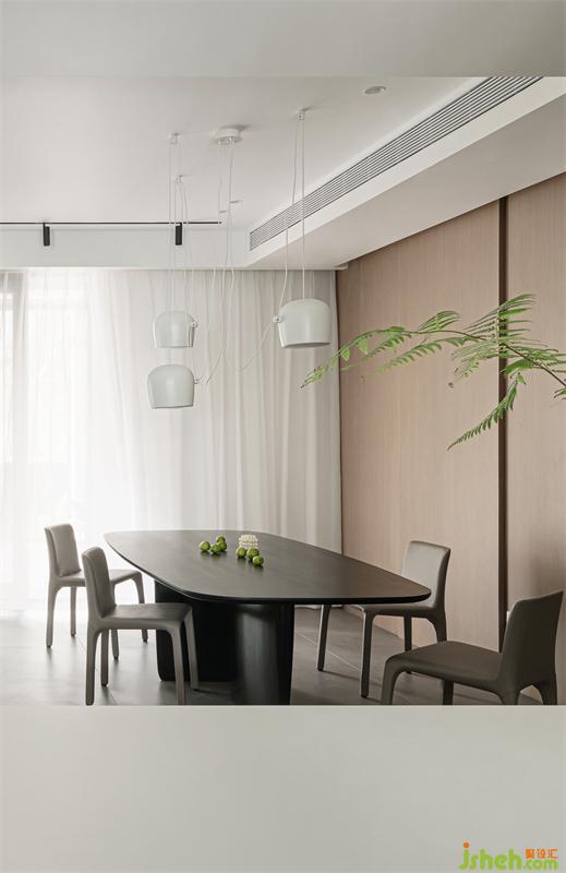 復(fù)式設(shè)計(jì)餐廳背景墻是木飾面和藝術(shù)漆結(jié)合,營(yíng)造自然放松的氛圍。綠色裝飾畫(huà)很好的融入整個(gè)餐廳似乎本來(lái)就是其中的一份子。