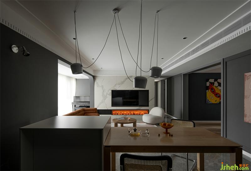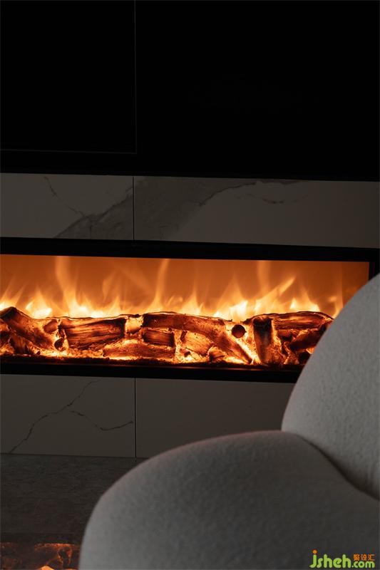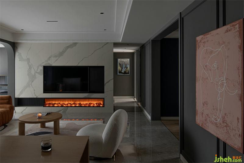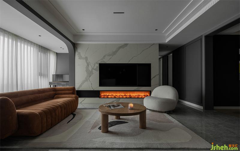 精裝房改造客廳原有頂面拆除,無(wú)主燈設(shè)計(jì)增加光源的同時(shí)安裝風(fēng)管機(jī),家具軟裝我們多選用暖色調(diào)打造時(shí)尚空間。巖板電視墻是男主人指定的材質(zhì),巖板質(zhì)感、壁爐為空間增加一絲暖意。