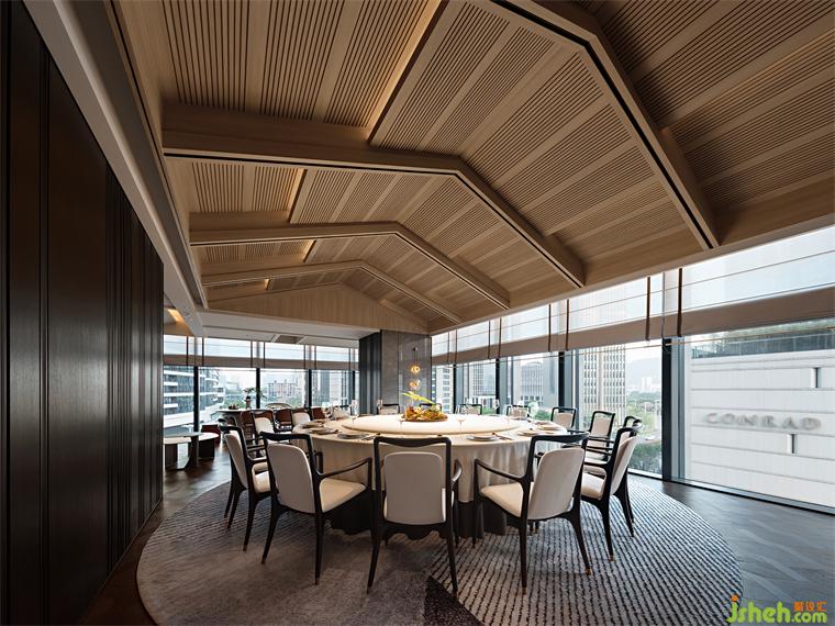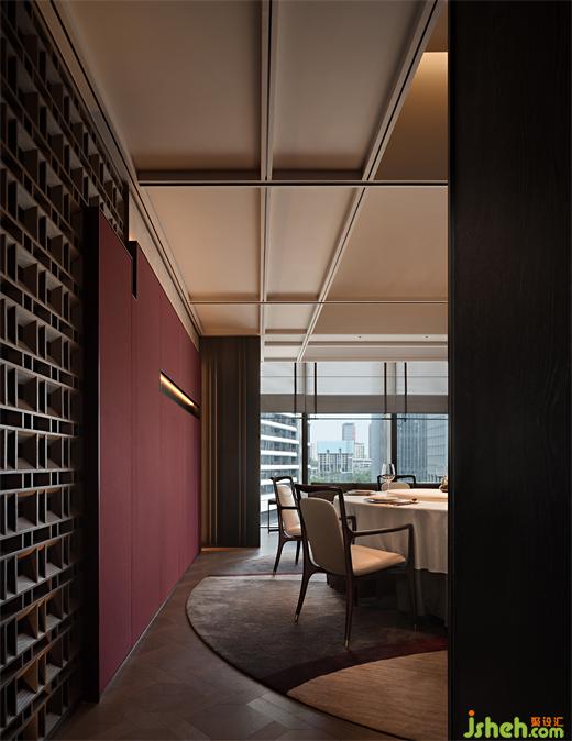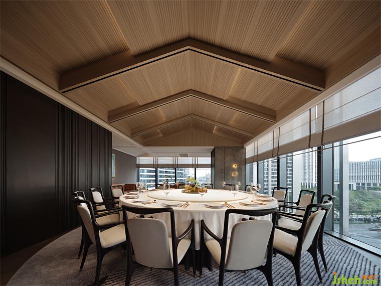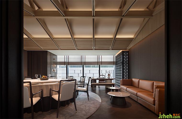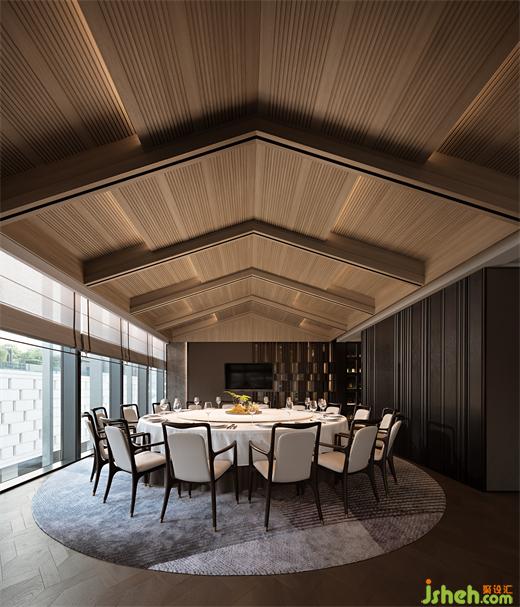木葉下,江波連,秋月照浦云歇山。云外歡宴,亭下流觴,在親友共慶的時刻,亦有閑情美景為空間點染閑適與寂靜的氛圍。古典窗格隔斷、歇山式天花的運用,即是在石材與木飾面的背景上落一筆精致傳神的點睛之墨,設計師用古雅的藝術(shù)筆觸,突破古典與現(xiàn)代的藩籬,餐廳設計以恢弘視角連通不同時代的審美,營造孑然于時光之外的文化雅集。