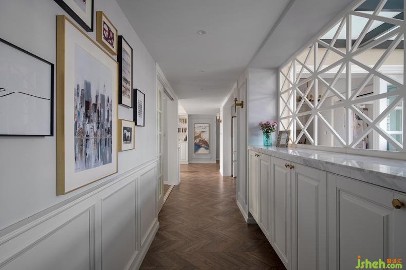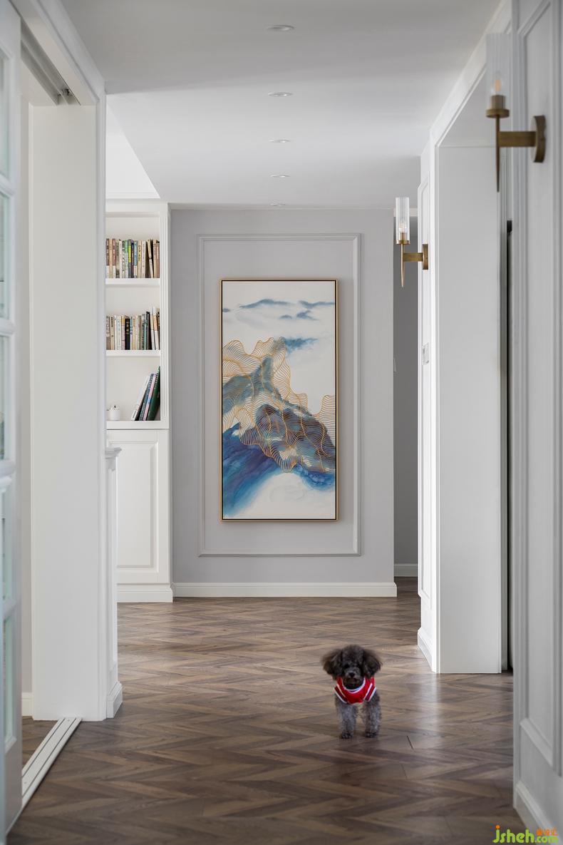 書房采用玻璃移門,為走道帶來充沛的采光。走道盡頭一副抽象派裝飾畫,增添雅致的韻味。合理的動線,讓愛犬皮皮可以盡情的在家里撒歡。
