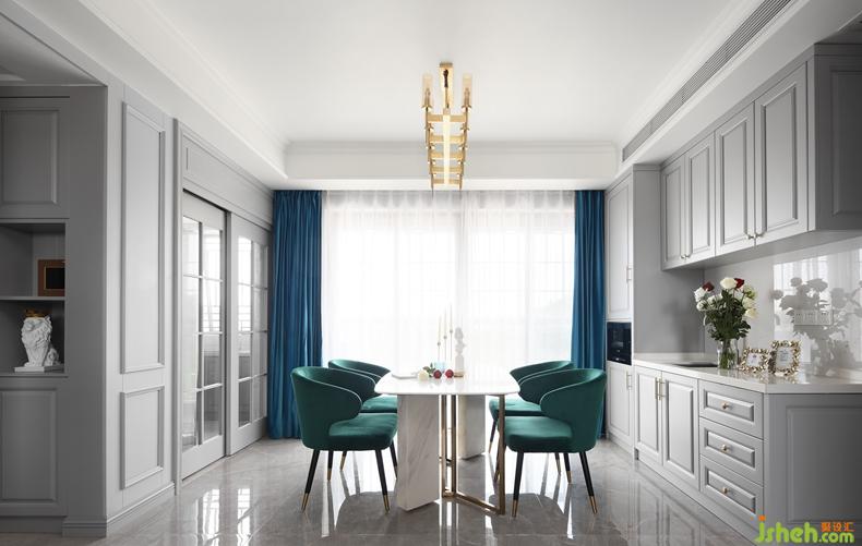 △再少不能少儲物,所以靠墻打造了整排的櫥柜和吊柜,同時設(shè)計了上下水,可以用來做西廚。櫥柜造型與墻面遙相呼應(yīng),讓整個餐廳格外的和諧。