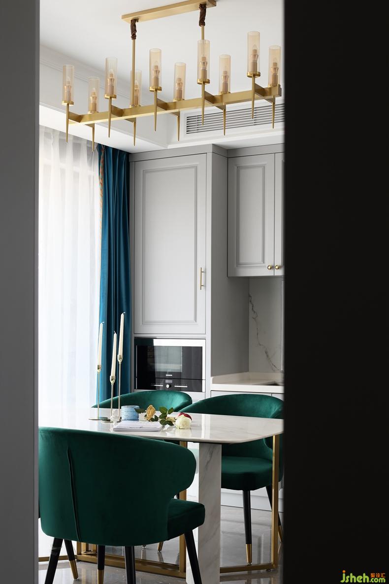 △主基調(diào)素雅的空間里,用恰到好處的軟裝色彩提亮整體的明亮度,豐富視覺層次。黃銅元素、大理石背景墻、軟裝...互相協(xié)調(diào),呈現(xiàn)簡約大氣卻飽含精致韻味的空間。