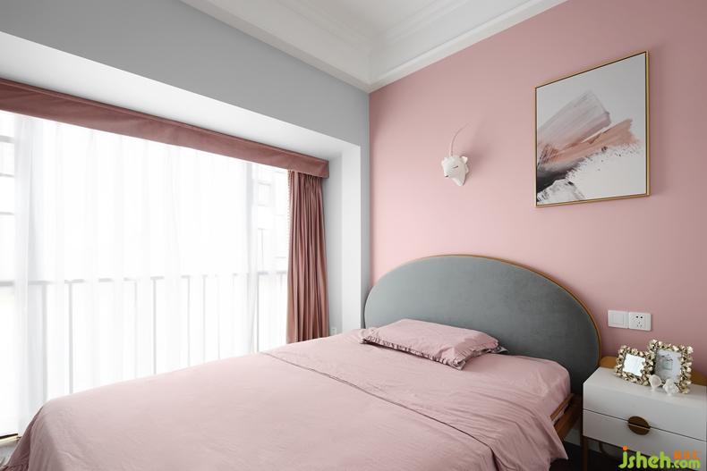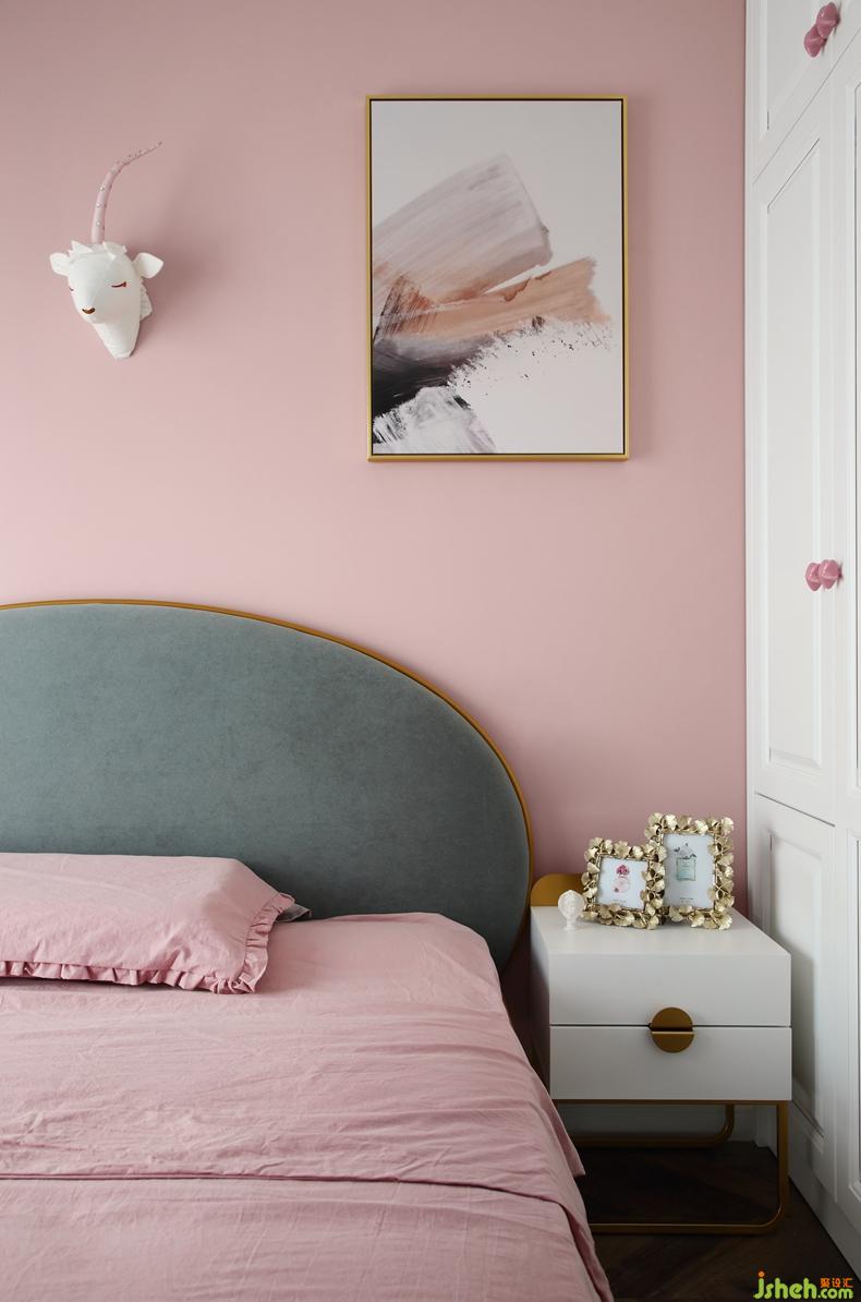 △女兒房則選擇嫩粉色做主色調,高級灰的床頭做點綴,避免大面積粉色帶來的甜膩,又保留了一片少女感。墻面獨角獸的裝飾,就像是孩子最好的守護神,守護著她的天真無邪和那份純潔。