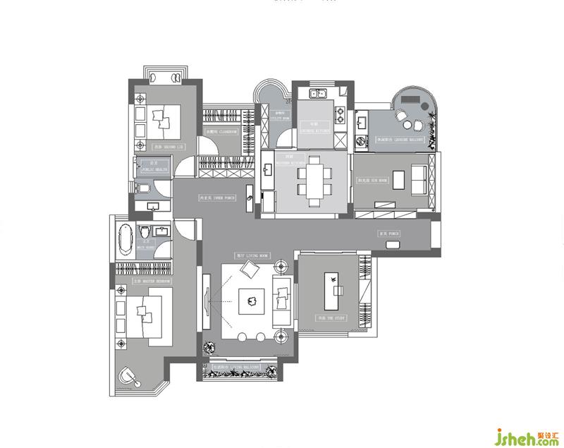 3.把廚房旁陽臺改為雜物間,分擔廚房儲物量,并將西廚功能轉(zhuǎn)移到餐廳,廚房僅作為中廚烹炒之用,讓功能更合理實用;