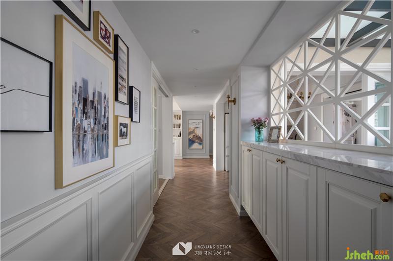 書房采用玻璃移門,為走道帶來充沛的采光。走道盡頭一副抽象派裝飾畫,增添雅致的韻味。合理的動線,讓愛犬皮皮可以盡情的在家里撒歡。室內(nèi)設計師