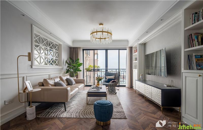 公共空間以簡約靜雅的色彩為主,柔和的大地色系呈現(xiàn)高級內(nèi)斂的質(zhì)感。電視背景墻兩側的柜體不僅是精致的裝飾,也擴充了儲物空間。