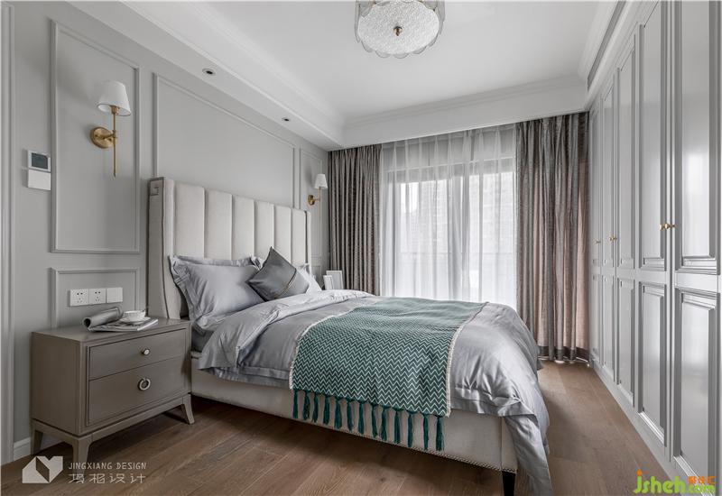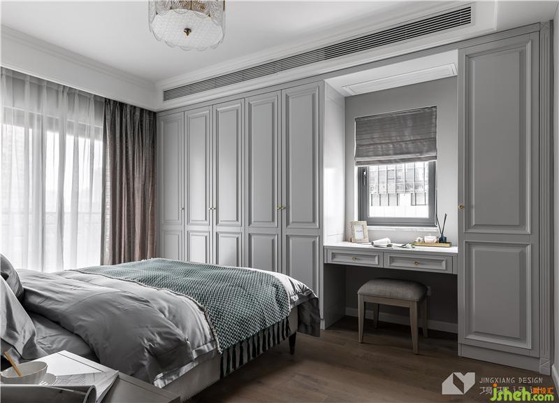 依舊利用石膏線條打造簡(jiǎn)潔感,優(yōu)雅的法式雙人床舒適宜人。靠墻是整排通高的柜子,柜門的造型與墻面的線條相呼應(yīng),形成視覺的統(tǒng)一。預(yù)留出大量的空間,專門給寶寶的嬰兒床留位置。