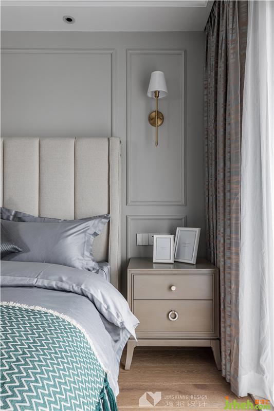 雙人床的床頭較高并且本身就富有腔調(diào),所以背景墻上就沒有做過(guò)多的設(shè)計(jì)。壁燈、線條刻畫出對(duì)稱美,又利用床頭柜的不同色彩打破這種對(duì)稱,找到二者之間的平衡。室內(nèi)設(shè)計(jì)師