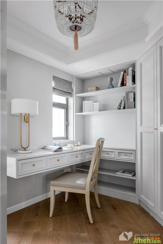 書房跟主臥連在一起形成套間,但同時(shí)又有獨(dú)立的門阻隔,休息和工作區(qū)保持獨(dú)立性。墻上與桌子底部都設(shè)計(jì)成開放式的柜體,方便書本的存放和查閱。懸空的書桌做成抽屜樣式,增加雜物的儲(chǔ)物能力。
