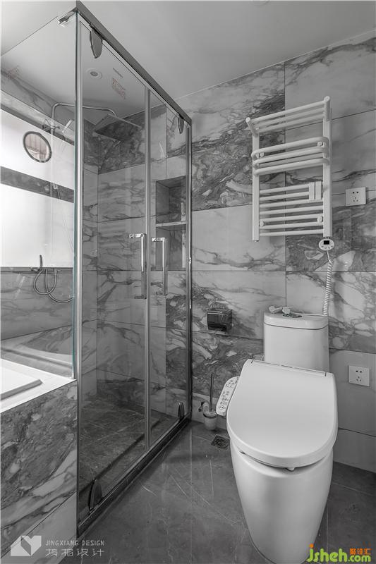 用玻璃門隔斷濕區(qū),防止干區(qū)淋濕,還能提升整體的通透性。利用馬桶上方安裝了電毛巾架,讓毛巾時(shí)刻保持干凈清爽。室內(nèi)設(shè)計(jì)師