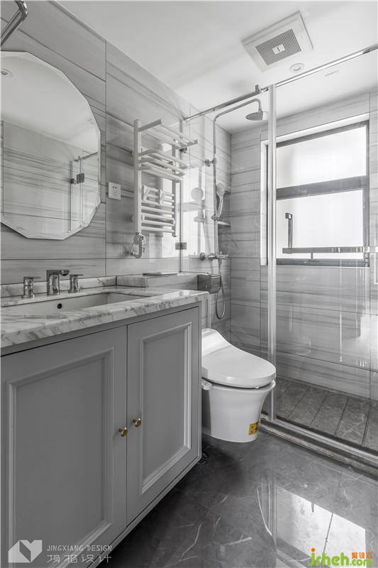 客衛(wèi)也做了干濕分區(qū),同樣利用玻璃門來阻隔水的噴濺,同時(shí)又能保證透光性。墻上鋪貼的橫條紋瓷磚視覺上拉伸空間,增強(qiáng)開闊性。室內(nèi)設(shè)計(jì)師