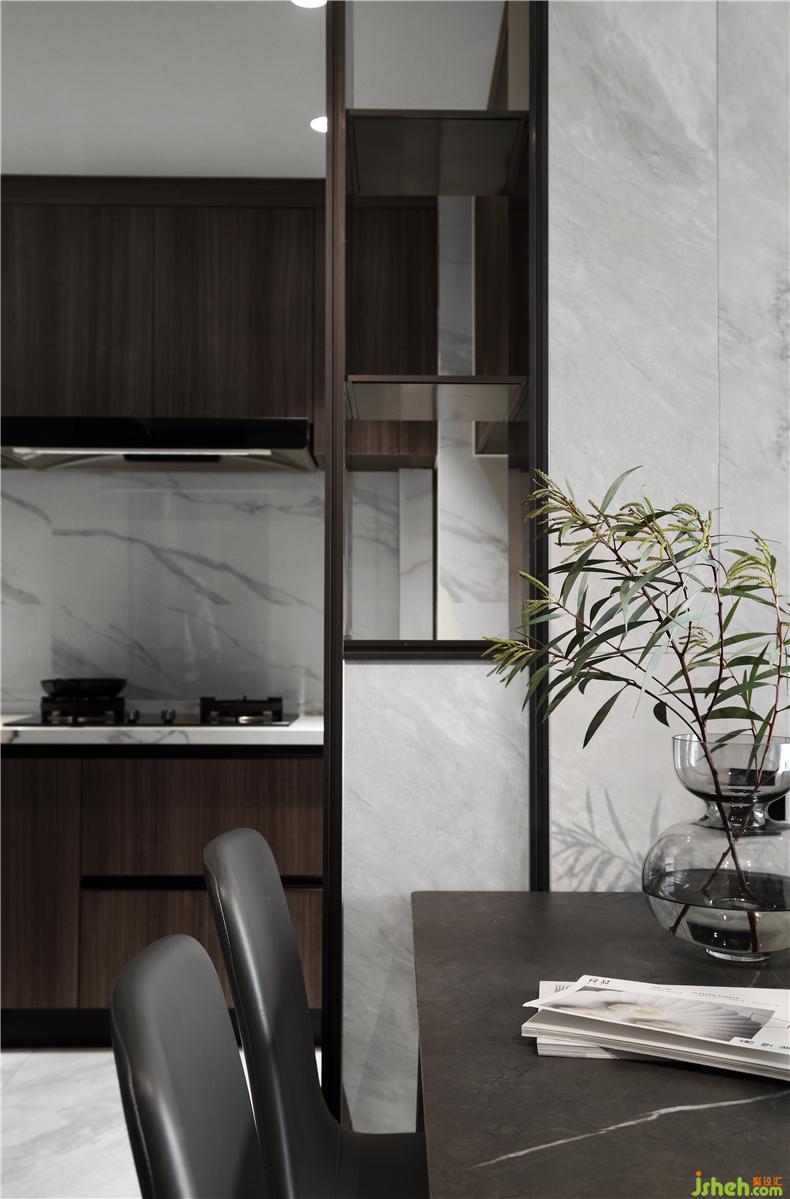 餐廳與廚房之間的開放式門洞做成展示架樣式,供屋主擺放相框紅酒等物品,用生活為設(shè)計(jì)加碼。