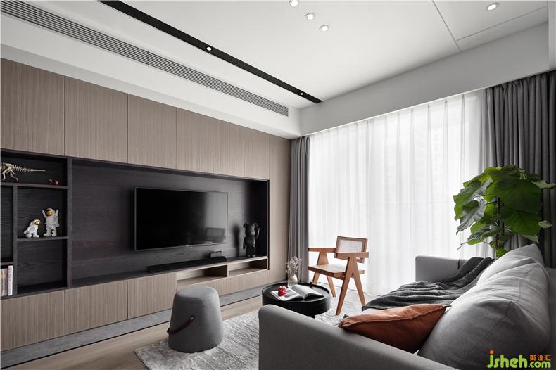 電視背景墻利用不同深淺的木色交錯(cuò)來(lái)凸顯出空間層次,室內(nèi)設(shè)計(jì)師減少視覺(jué)疲勞感,封閉和開(kāi)放式相結(jié)合的設(shè)計(jì),滿足女屋主的儲(chǔ)物和男屋主的展示需求。只要設(shè)計(jì)得當(dāng),客廳自然能將美觀性和實(shí)用性都兼顧。