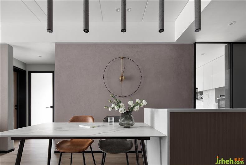 以極簡(jiǎn)掛鐘為裝飾,餐廳背景墻的設(shè)計(jì)清爽自然,保證了客餐廳基調(diào)的統(tǒng)一。室內(nèi)設(shè)計(jì)師頂部安裝了線性吊燈,補(bǔ)充了餐廳的縱向?qū)哟胃?,同時(shí)讓空間更有格調(diào)