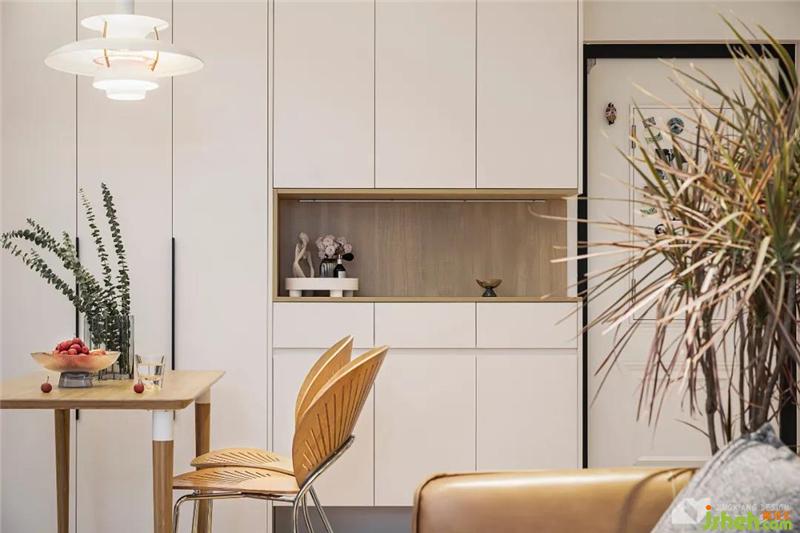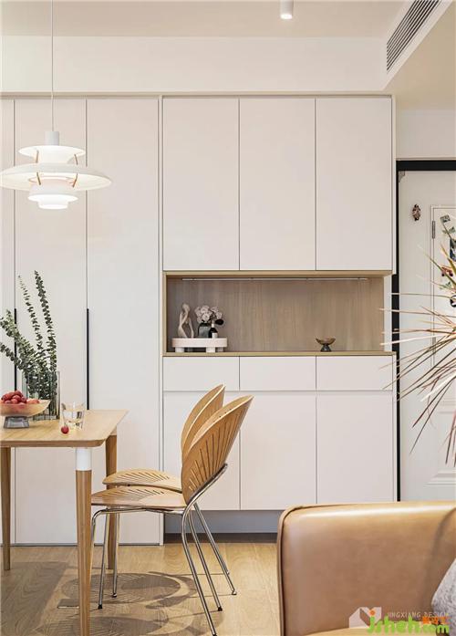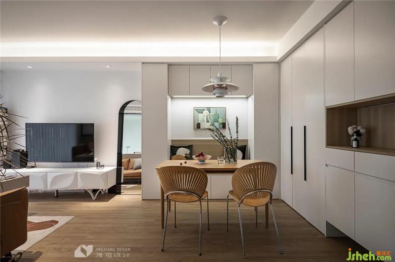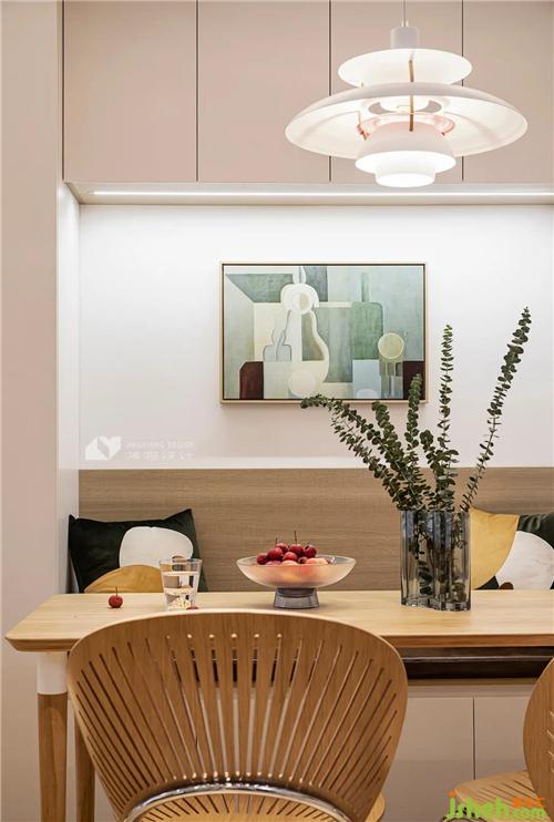 靠墻的一側(cè),定制卡座,減少空間的占用。上方裝有吊柜做收納,卡座底部也做了儲(chǔ)物設(shè)計(jì),彌補(bǔ)了餐邊柜的功能。