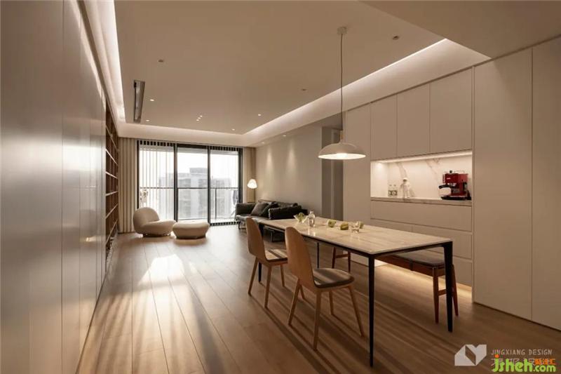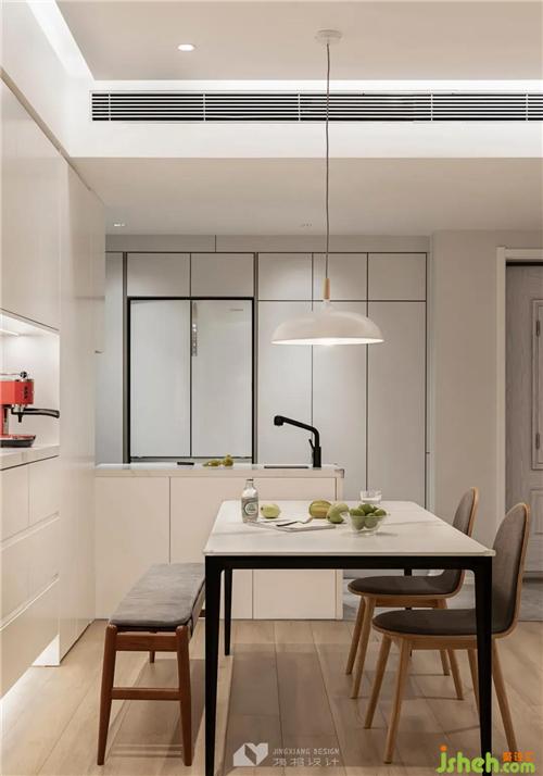 定制餐邊柜,有藏有露,開放格處放置咖啡機(jī),安裝的燈帶方便咖啡制作。餐桌上方一盞北歐風(fēng)簡(jiǎn)約吊燈,用光線為食物添彩,每一餐都精致愉悅。