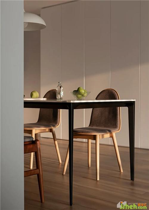 黑白配色餐桌和木質(zhì)餐椅的搭配,與空間整體風(fēng)格自然融合,餐椅上的灰色坐墊,沉淀出空間的穩(wěn)重質(zhì)感。