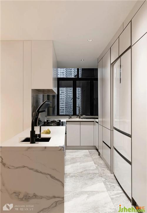 U型廚房?jī)?yōu)化生活動(dòng)線。根據(jù)梁體合理布置整面儲(chǔ)物柜,掩蓋空間缺陷,視覺上更加統(tǒng)一。島臺(tái)采用大理石材質(zhì),既可做水吧臺(tái),深圳室內(nèi)設(shè)計(jì)師也能做西廚處理冷食。