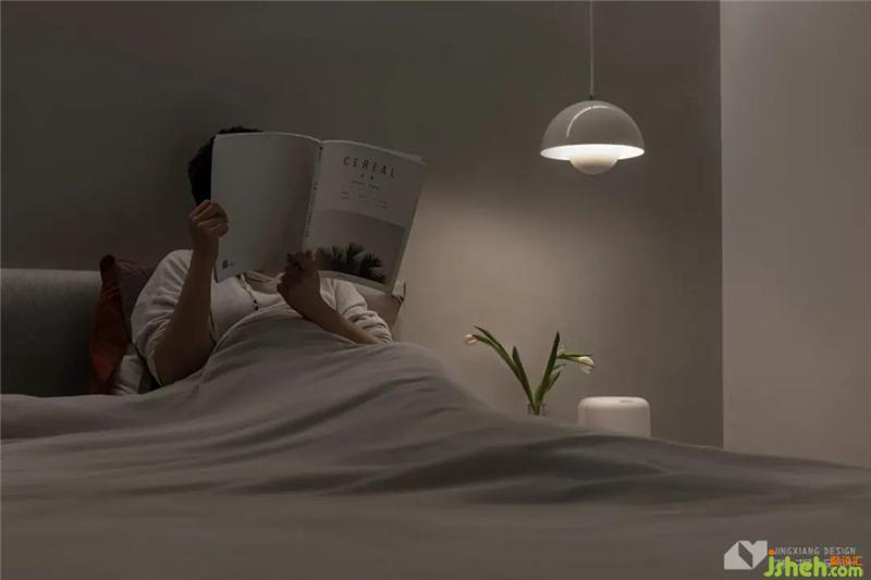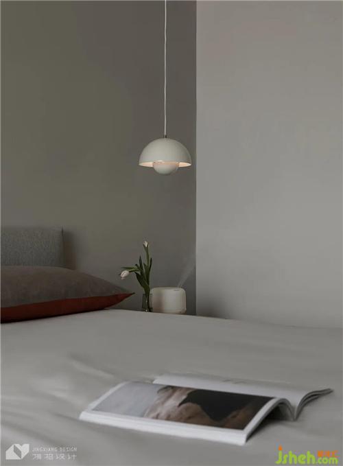 床頭兩側分別安裝臺燈和吊燈,突破對臥室布置的刻板印象,形成非對稱之美,功用上二者也各有側重,既能照明,也能烘托氛圍。